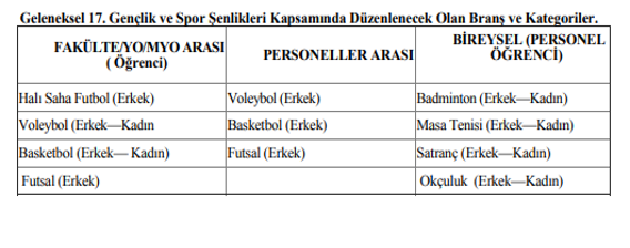 Aşağıdaki branş ve kategorilerde fakültemiz adına takımlar oluşturulacaktır. Takımlarda yer almak isteyen personel ve öğrencilerin linkte yer alan bilgileri doldurup 24.10.2025 tarihine kadar göndermeleri gerekmektedir.