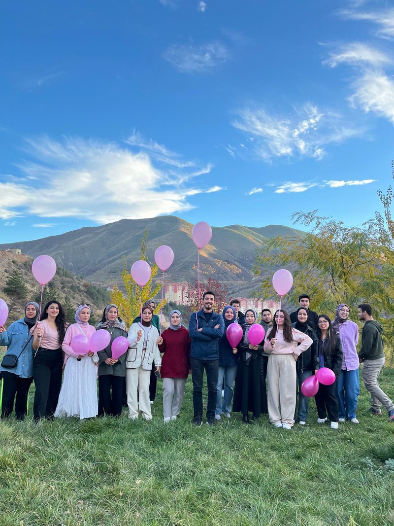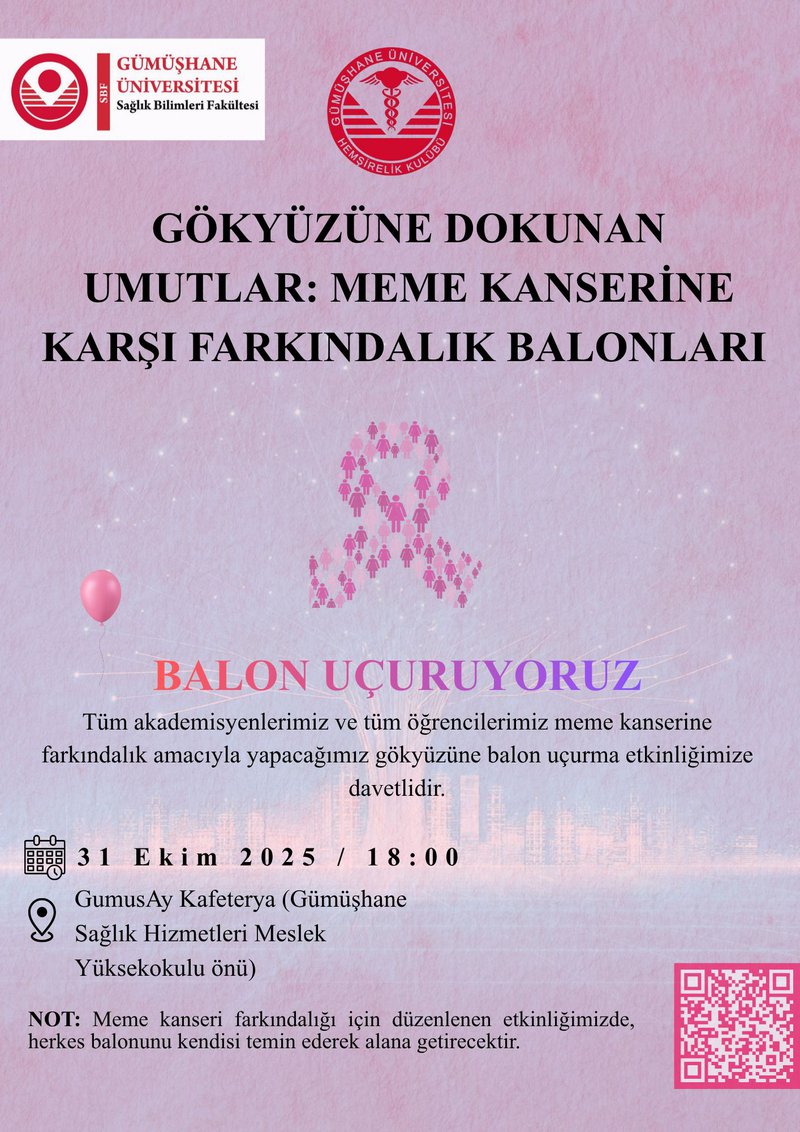 Gümüşhane Üniversitesi Sağlık Bilimleri Fakültesi Hemşirelik Bölümü ve Hemşirelik Kulübü tarafından, meme kanserine dikkat çekmek amacıyla “Gökyüzüne Dokunan Umutlar: Meme Kanserine Karşı Farkındalık Balonları” etkinliği düzenlendi.