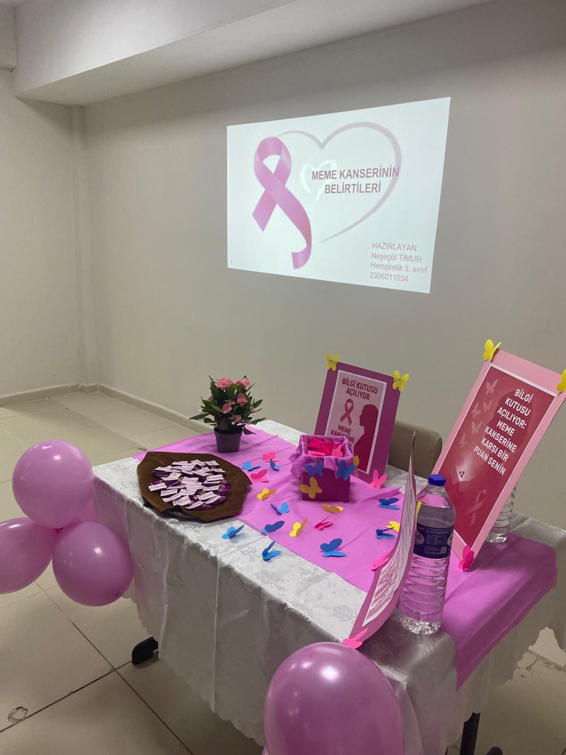 Hemşirelik Bölümü 3. sınıf öğrencilerinden Neşegül TİMUR “Meme Kanseri Belirtileri”, Sıla ÇELİK “Meme Kanseri Risk Faktörleri” ve Tuğba DALKILIÇ ise “Kendi Kendine Meme Muayenesi (KKMM) ve Tanılama Yöntemleri” başlıklı sunumlarını paylaştı.